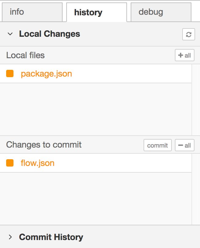 Whenever you change a project file, such as by deploying a new flow configuration, it will be listed in the ‘Local files’ section. You can click on the file name to see a diff of what has changed. When you hover over the file, you’ll see a + button - clicking that will stage the file - moving it down to the ‘Changes to commit’ list.